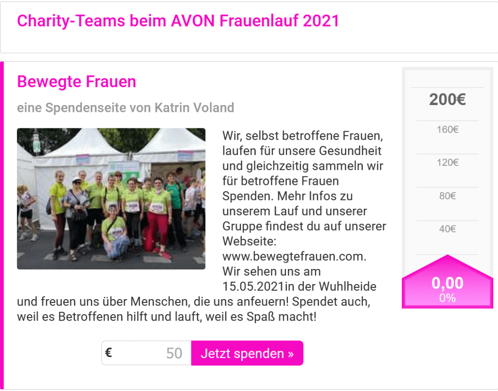 Jedes Jahr findet der AVON Frauenlauf zu Grunsten der betroffenen an Brustkrebs erkrankten Frauen im Berliner Tiergarten statt. Jedes Jahr war diese Veranstaltung ein riesiges Event, um Gutes zu tun, bis Corona kam und blieb. Die Berliner Krebsgesellschaft e.V. unterstützen wir schon seit Jahren. Jährlich sammeln wir Spenden, aber wegen dieser besonderen Zeit fiel schon im letzten Jahr der Spendenlauf aus. In diesem Jahr sollte es wieder losgehen, doch da steht am Ende ein großes Fragezeichen.